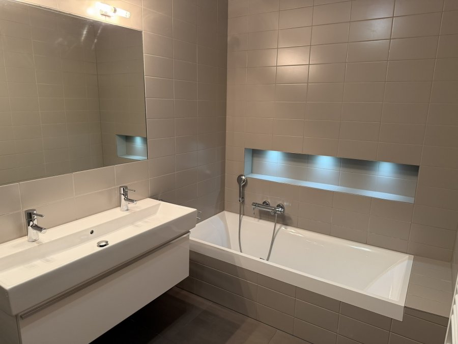 Salle de bains comprenant : double lavabo, douche et baignoire
