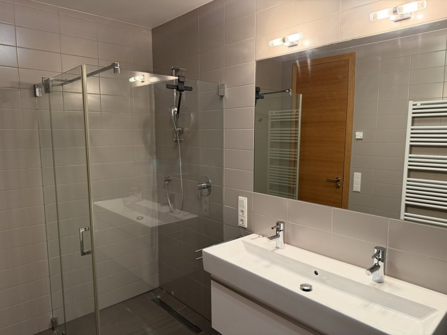 Badezimmer mit: Doppelwaschbecken, Dusche und Badewanne